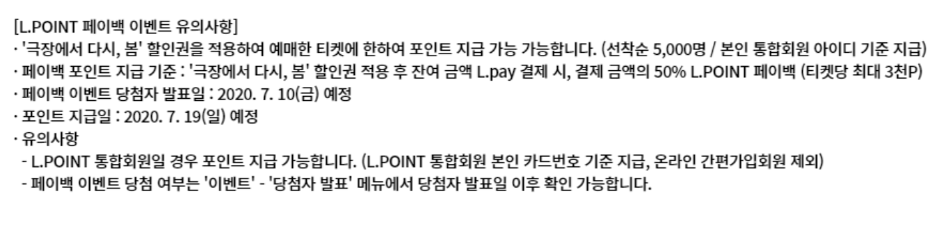 2020년 6월 4일 부터 쿠폰을 나누어 주는 캠페인 이름은 '극장에서 다시.봄' 인데, 이 할인쿠폰은 133만장으로 수량이 한정되어 있습니다. 영화를 볼지 말지 망설여 진다고 해도 일단은 쿠폰을 받아 놓으면 볼일이 생기겠습니다. 저도 쿠폰을 받아 사람이 제일 없는 시간대에 관람을 해볼 예정입니다.