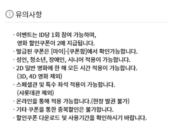 유의사항은 ID당 한 번만 매주 1번 씩만 참여할 수있고 쿠폰을 두장 받을 수가 있다는 것이고, 3D나 4D영화는 제외 된다고 합니다. 하지만 스래도 스페셜관이나 특수좌석은 사용하능하니 참고하셔야하겠습니다. 영화관에서는 관객들의 안전한 영화관람을 위해 좌석을 띄엄띄엄 배치하는 등의 시행을 하고 있으니 미리 영화관에 문의를 하는 것도 좋은 방법으로 보입니다.
