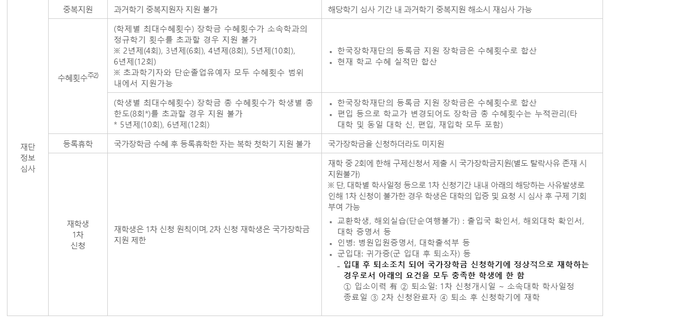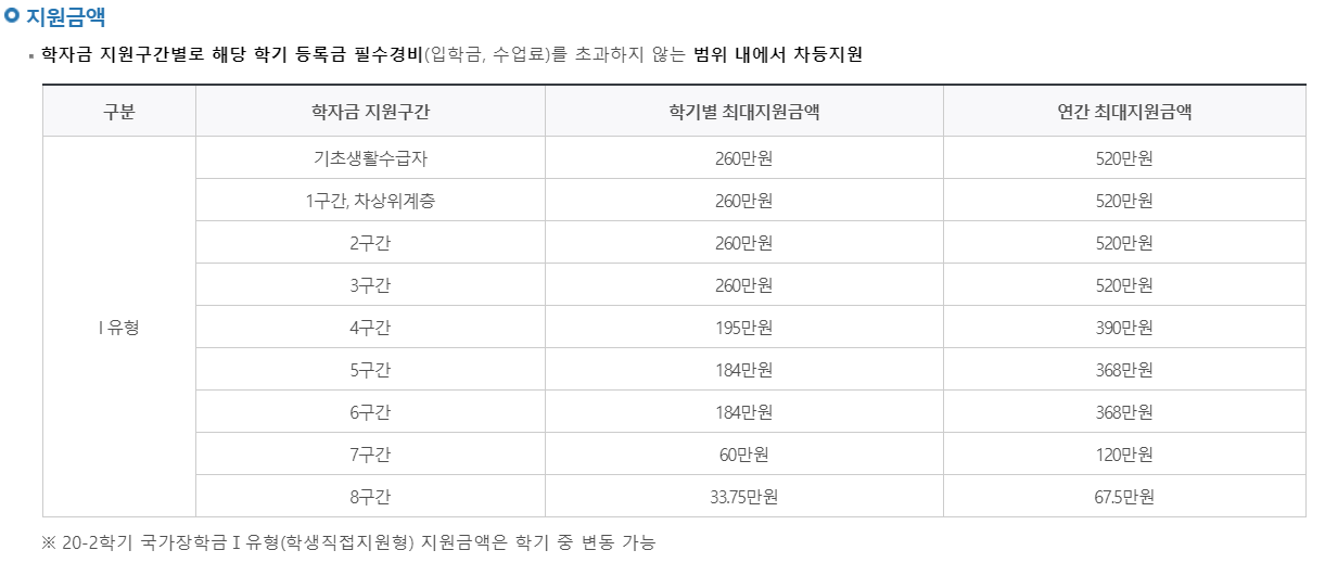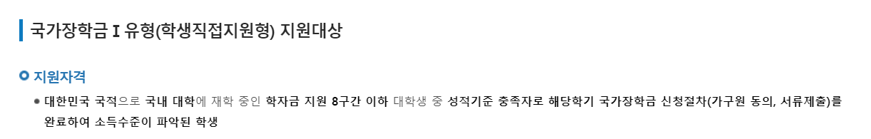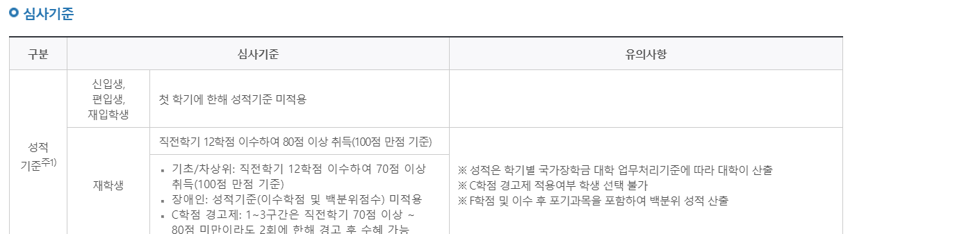 1유형의 경우라면 재학생을 기준으로 말씀드리면 바로 직전학기에 최소 12학점을 마쳐야 하고 평균 B학점 이상을 받아야합니다. 만약 차상위계층에 해당되는 분들은 70/100을 받으셔야합니다.