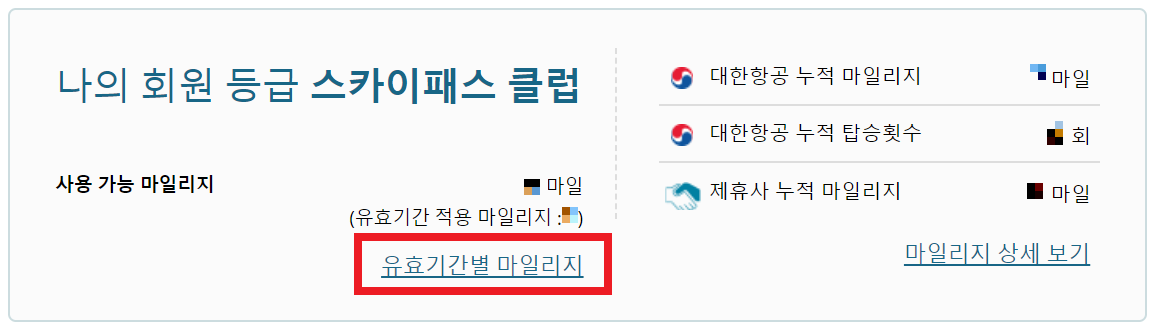 마이페이지로 접속하시면 바로 아래 나의 회원등급 스카이패스 클럽 아래 사용가능 마일리지를 확인하실 수가 있습니다. 사용가능 마일리지 아래 유효기간별 마일리지로 집입을 해봅니다.