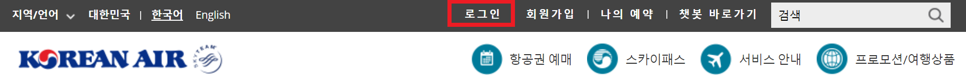 https://www.koreanair.com/korea/ko.html대한항공 홈페이지 링크로 접속하시면 아래와 같은 화면에서 일단 로그인 눌러서 로그인을 해줍니다.