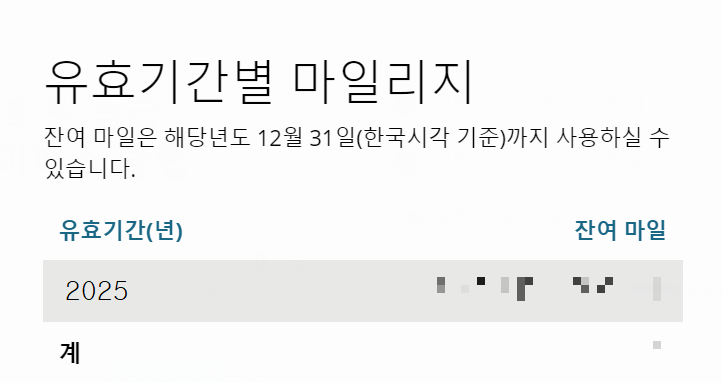 여기서 유효기간을 확인하실 수가 있습니다. 제가 가지고 있는 마일리지는 2025년까지 이네요. 2025 년 12월 31까지 사용을 할 수가 있는 것입니다.