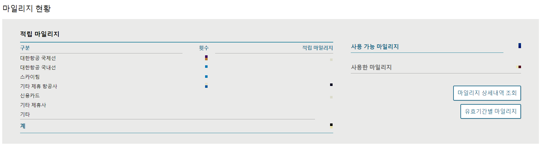이 뿐아니라 전 화면에서 마일리지 상세보기로 접속을 하시면, 더욱 자세한 적립 마일리지 현황을 국제선 국내선 등 제휴항공사 그리고 신용카드로도 적립된 내용을 확인하실 수가 있습니다.