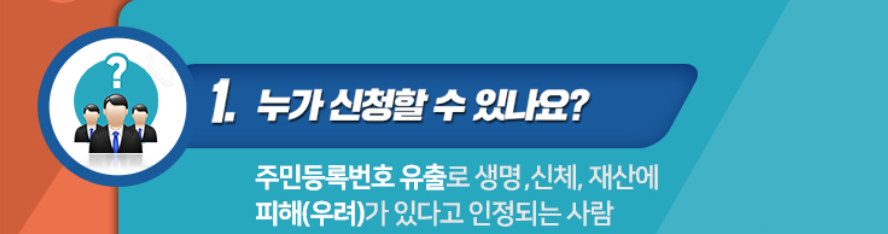 그렇다면 신청대상에 대해 더욱 자세하게 알아보겠습니다. 신청대상은 위에서 얘기한대로 주민등록번호 유출로 인해 피해를 받거나 받을 우려가 있는 분들이 대상이며, 아래 중 하나에 해당 하여야합니다.