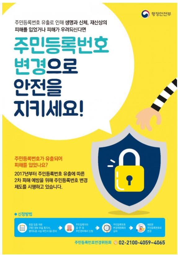 주민등록번호의 유출로 인해서 불안함을 해결함과 동시에 2차로 피해를 받을 것을 예방하기 위해서 변경을 하게 된다면, 주민등록번호변경위원회가 변경신청을 한 것에 대해서 심사를 하게 됩니다. 심사 후 확정이 나면 주민등록번호를 바꾸어주는데, 모두 바뀌는 것은 아니고 주민등록번호 의 뒷자리만 바꾸어주는 것입니다.
