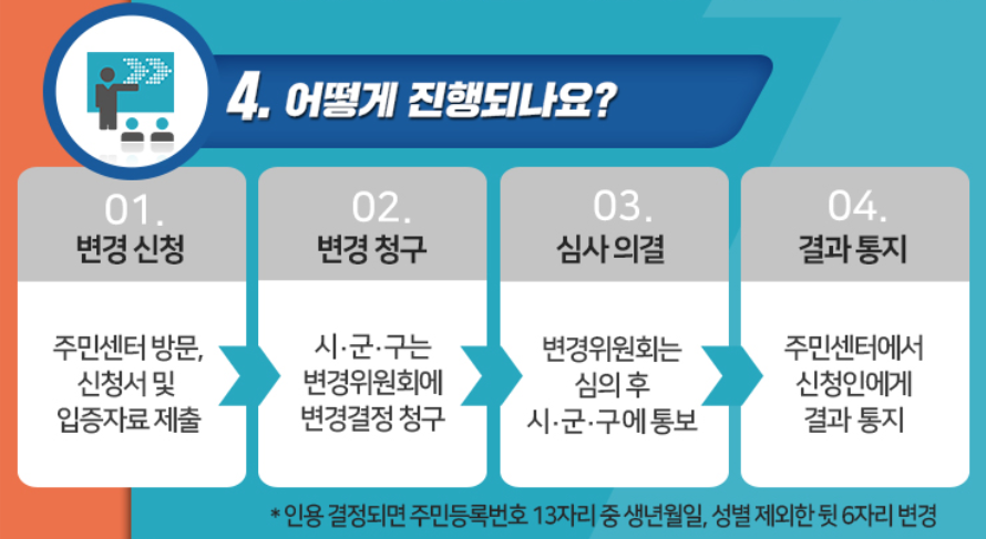 그렇다면 주민등록 번호의 변결 절차는 어떻게 될까요. 변경신청은 신청자가 신청서와 입증자료를 준비해서 주민센터나 동사무소에 방문을 하게 됩니다. 주민등록번호 번호의 결정은 시장/군수/구청장이 하게 되는데 신청을 한 뒤 사실 조사와 주민등록번호 변경위원회에서 심사와 의결을 하게 됩니다.