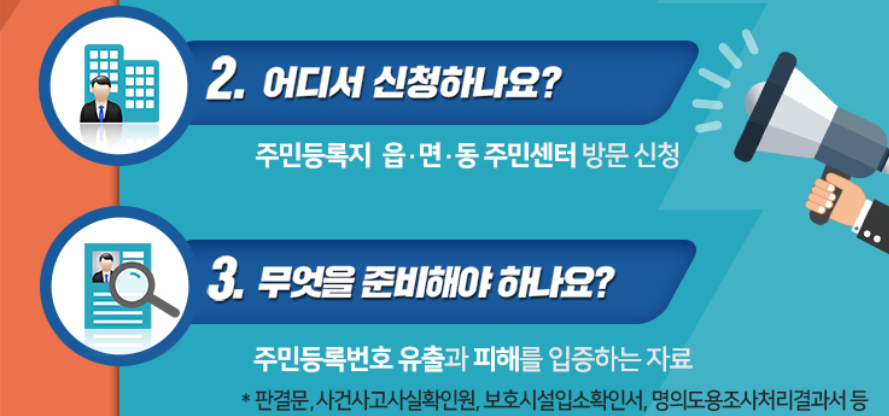 그렇다면 신청대상에 대해 더욱 자세하게 알아보겠습니다. 신청대상은 위에서 얘기한대로 주민등록번호 유출로 인해 피해를 받거나 받을 우려가 있는 분들이 대상이며, 아래 중 하나에 해당 하여야합니다.