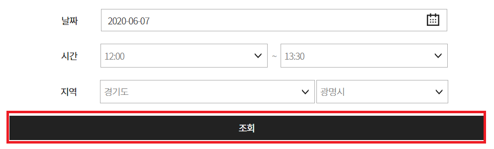 휴일지킴이약국 검색하기를 눌러서 진입한 뒤 검색하기에서 원하는 날짜와 시간, 그리고 지역을 눌러 조회를 진행해 줍니다.