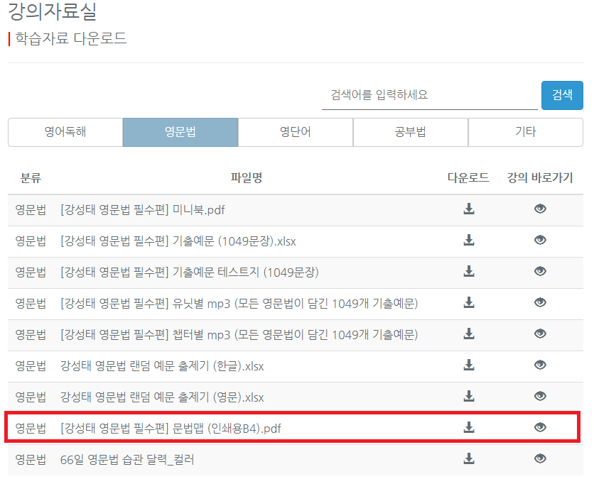 위 링크로 들어가주시면 아래처럼 강의자료실로 바로 연결됩니다. 그 중에서 강성태의 영문법 필수편 - 문법맵 (인쇄용 B4)를 눌러서 다운받아 주시거나 제가 올려드린 파일을 그대로 다운받으셔도 되겠습니다.