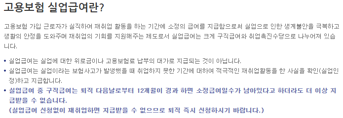 이렇게 실질적은 금액으로서 지원을해주고 있지만 실업급여 자체가 위로금의 개념으로 주는 것은 아닙니다. 또한 실직기간 중에 다시 재취업을하기 위해 노력을 하고있다는 사실 또한 확인을 하게 되고, 구직급여는 퇴직한 날짜의 다음날 부터 1년이 경과되면 소정급여일수의 잔여일이 남아있어도 지급을 받을 수가 없습니다.