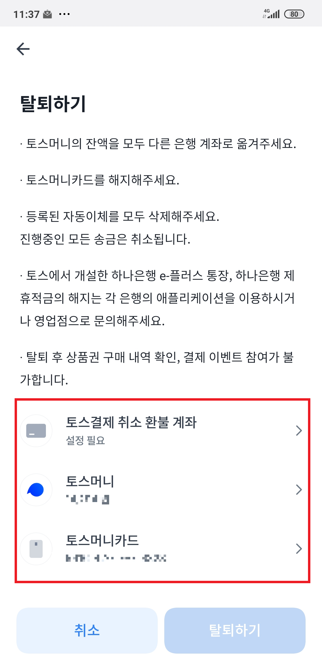 토스머니의 잔액을 모두 다른 은행의 계좌로 옮기고 카드를 해지하고 자동이체를 삭제해주셔야 탈퇴를 할 수가 있습니다. 그리고 토스를 통해 개설한 다른 은행의 계좌들도 처리를 해야겠지요. 이 내용들을 처리하지 않으면 탈퇴하기 버튼이 활성화 되지 않습니다.