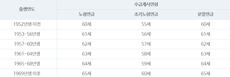 국민연금 수령나이를 먼저 알아보겠습니다. 알아두셔야할 점은 본인의 출생년도 별로 노령연금을 받을 수 있는 나이가 조금씩 차이가 있다는 것입니다.