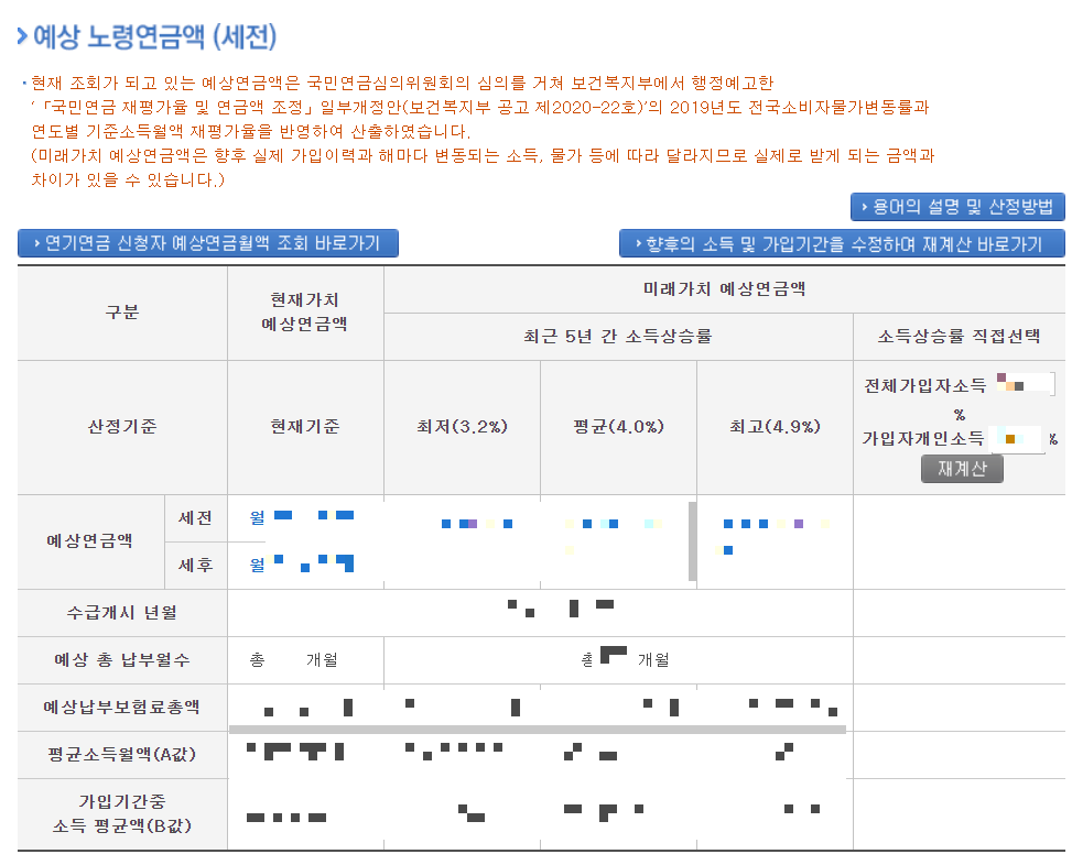예상 노령연금액 (세전) 화면을 확인하실 수가 있습니다. 현재의 기준에서의 금액을 포함하여 미래에 받을 수 있는 예상되는 노령연금 수령액도 조회가 가능합니다.