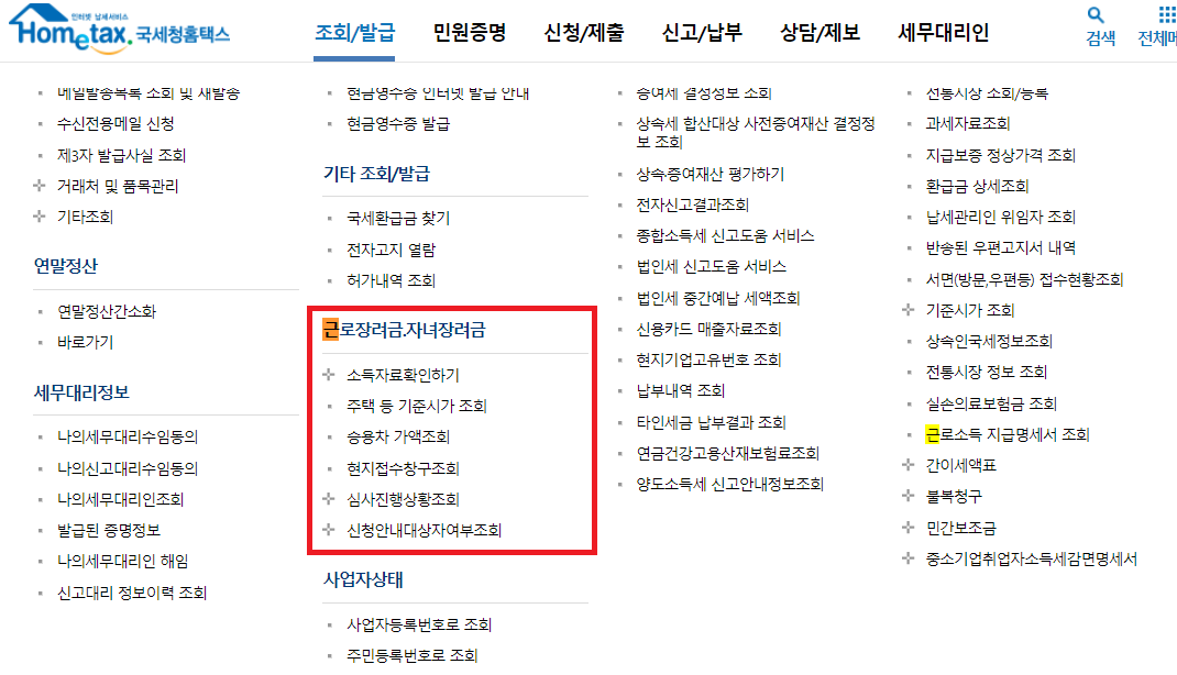 전화 뿐만 아니라 홈텍스에 접속해도 근로장려금 자녀장려금에 대한 조회가 가능합니다.