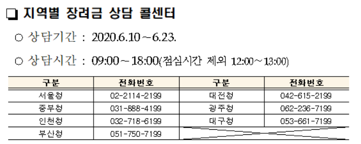 혹은 장려금에 대한 상담을 원하신다면 6월 10일부터 6월 23일까지 각 지역별로 상담센터를 운영하고 있으니 아래 이미지를 보고 본인의 관할 지역청에 전화하여 문의하시면 됩니다.