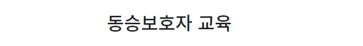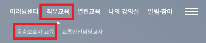 동승보호과정을 신청하기 위해서는 홈페이지 첫화면 오른쪽 상단 직무교육메뉴에서 동승보호자 교육으로 들어가 준 뒤 제일 하단 신청하기를 눌러 신청을 해줍니다.