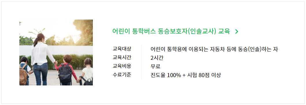 - 통학버스의 "동승보호자(인솔자)"는 "동승보호자 사이버 교통안전교육"을 의무가 아니지만 들어야하겠습니다. 이는 차량의 동승자교육으로 운전자와는 별개의 내용입니다.