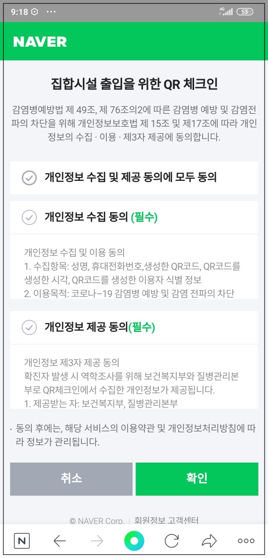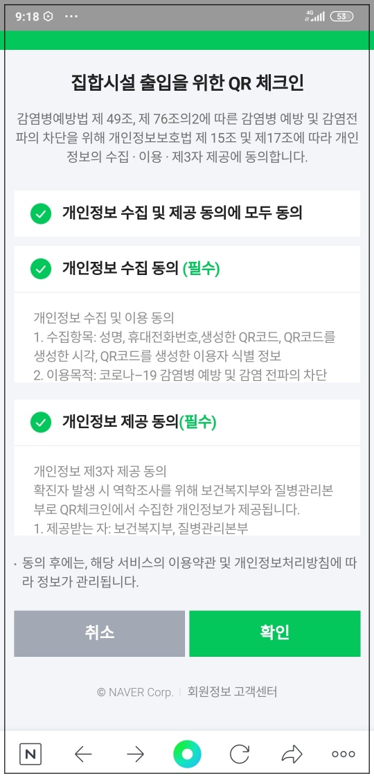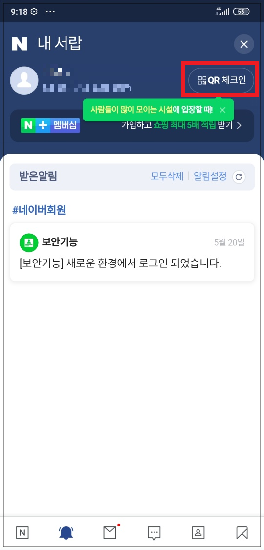 이제 개인 메뉴를 설정할 수 있는 프로필화면 , 네이버 내서랍으로 진입했습니다. 다시 오른쪽 상단을 보면 QR 체크인이라는 메뉴가 보이게 됩니다. 이제 QR체크인을 눌렀다면 집합시설 출입을 위한 QR체크인의 개인정보수집동의와 개인정보제공동의에 동의를 해주시면 됩니다.