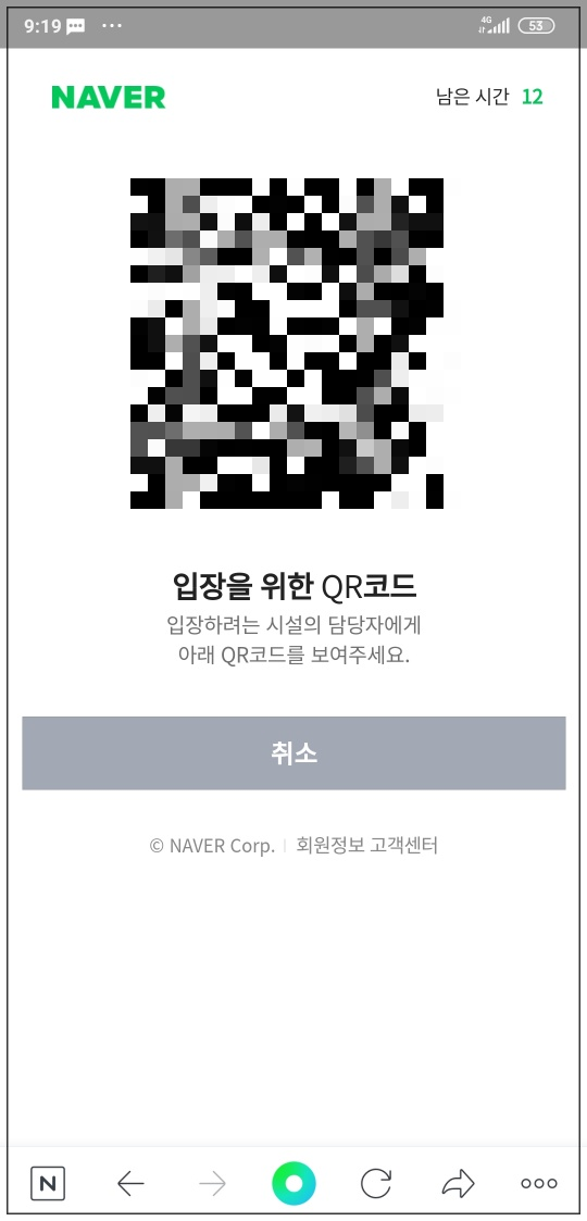 인증을 완료하게 되면 QR 코드가 발급이 됩니다. 이제 이 발급된 QR코드를 시설관리자 혹은 시설 담당자에게 제시한 후, 해당시설에 입장을 하면 됩니다. 참고로 QR코드는 일회용으로 발급되며 발급되고 15초 이내에 찍지 않을경우 QR코드 유효시간의 초과로 새로고침 됩니다.