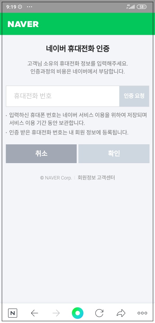 아래와 같이 동의를 완료하셨다면, 휴대전화를 인증해주세요.
