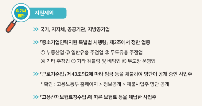 아쉽게도 대기업과 공공기업들은 제외대상이라고 합니다. 하지만 중소기업이나 중견기업들은 해당이 되게 되는데, 그 중에서도 상시근로자가 100명이상의 기업 중에서도 60세 이상을 고용한 비율이 이미 20%를 초과하게 되는 기업은 제외 대상입니다.