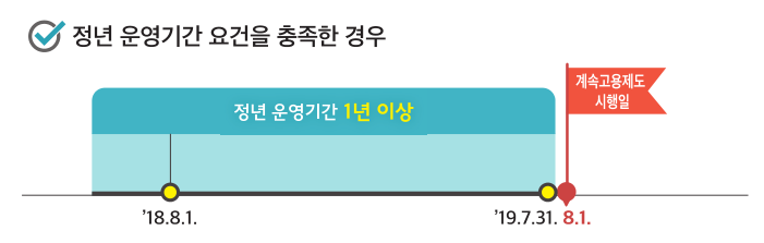 C. 혹은 정년의 변경이 없지만 정년까지 근무한 근로자를 다시 1년이상 계속해서 고용을 합니다. 아니면 퇴직을 한 후에, 3개월 안에 다시 재고용을 해야하며 이 때는 1년 이상의 근로계약서를 작성하여야합니다.