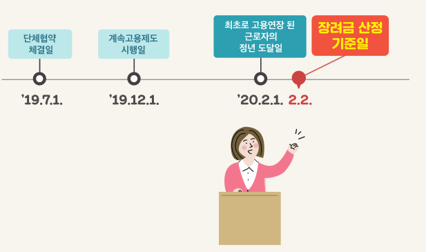 만약 K라는 기업이 2020년 6월 1일 취업규칙을 통하여 2020년 9월 1일부로 정년을 연장하기로 했다면, 그리고 이후에 최초로 연장된 근로자가 정년 도달이 2020년 3월 1일 이게 되면 다음날인 2020년 3월 2일이 장려금의 산정 기준일이 되는 것입니다.