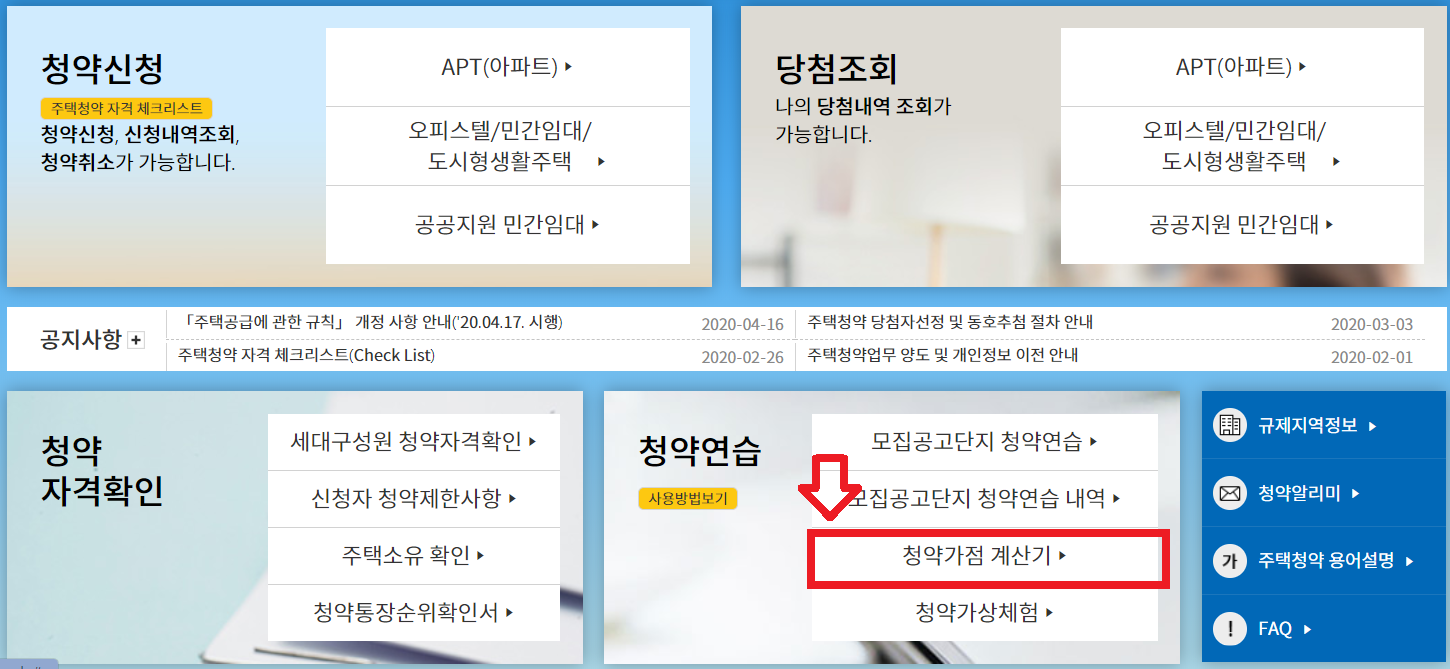 www.applyhome.co.kr 청약홈 바로가기 (링크) 를 이용해서 바로 접속해 줍니다. 접속을 한 뒤 청약가점 오른쪽 하단 청약 연습에서 청약가점 계산기를 찾아줍니다.