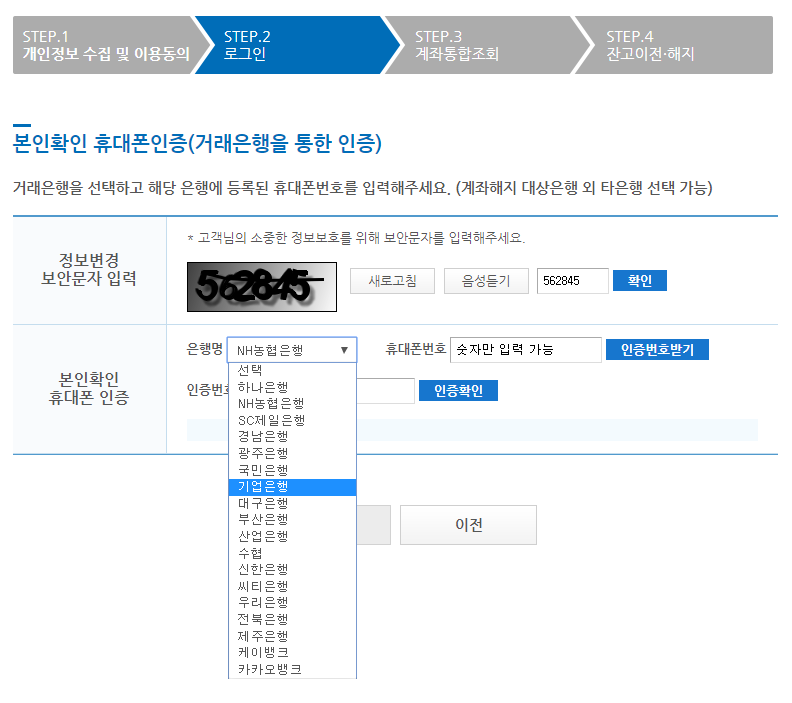 휴대폰 로그인을 할 때는, 본인계좌가 있는 것을 선택하고 휴대폰 번호를 입력해주어야 인증이 됩니다.