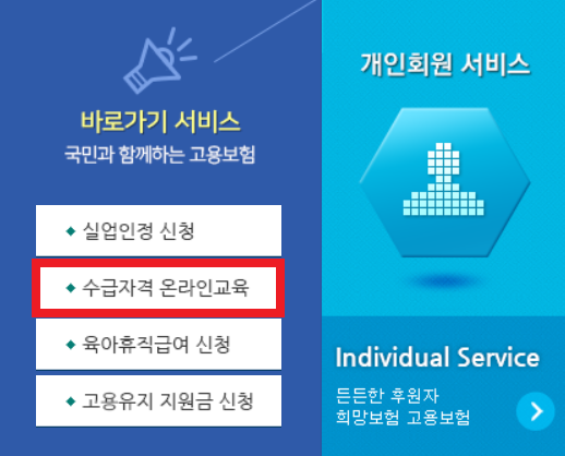그리고 고용보험 홈페이지로 접속하셔서 실업급여 온라인 수급자 교육을 이수하시면 됩니다. 1시간도 안되는 짧은 시간이기 때문에 빠르게 이수하시면 될 것 같습니다. https://www.ei.go.kr/ei/eih/cm/hm/main.do(링크)에 접속하시면 아래와 같은 화면이 보입니다. 왼쪽의 메뉴중 수급자격 온라인 교육을 눌러줍니다.
