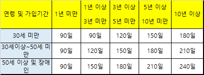 위에서 언급한 실업급여의 수급일수는 어떻게 구하나요? 구직을 하는 동안 구직급여를 지급받게 되는데, 이는 고용보험을 가입한 기간 그리고 회사를 그만 두었을 때 나이에 따라서 최소 90일 부터 최대 240일까지의 범위에서 산정이 되게되는데 아래와 같습니다.