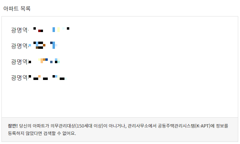 *참고로 본인이 거주하는 아파트가 K-APT 공동주택관리시스템상 등록이 되지 않았다면 검색을 할 수가 없다고 아래 친절하게 안내창이 나오는 것을 볼 수 있는데, 제가 과거에 잠깐 거주했던 8층짜리 아파트는 역시 검색이 안되는 군요.