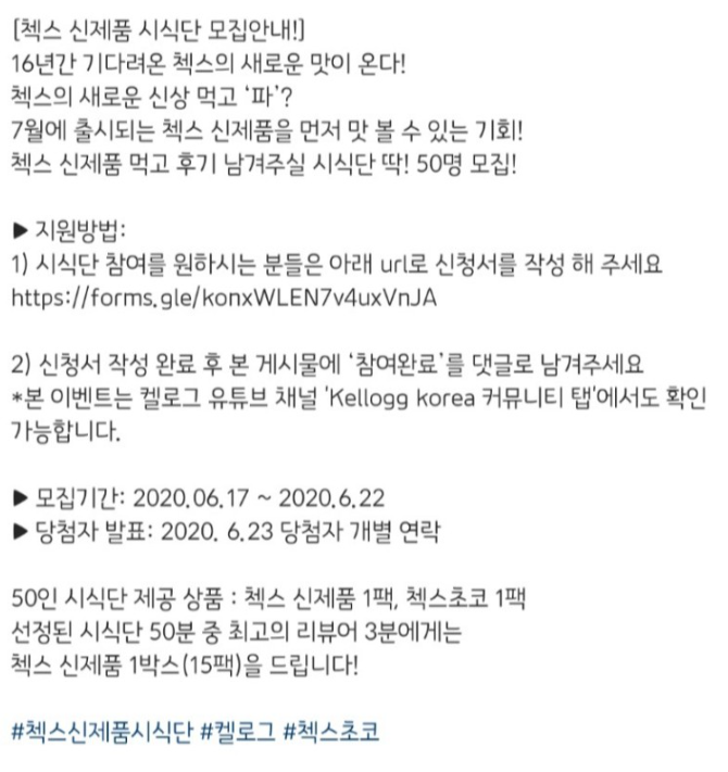 ⭐ 켈로그는 유튜브 채널 이외에도 인스타그램등에 첵스 신제품 시식단 모집공고를 올렸습니다. 하지만 제품특성상 그리고 Limited Edition으로 써있는 것으로 보아 한정판으로서 잠깐동안만 행사하는 이벤트 제품으로 생각이 됩니다.