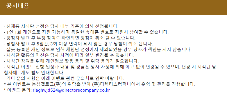 ⭐ 2020년 6월 17일부터 2020년 6월 22일까지 6일간에 걸쳐 시식단 신청을 받고, 2020년 6월 23일에 당첨자에게는 개별적으로 연락을 해준다고 합니다.