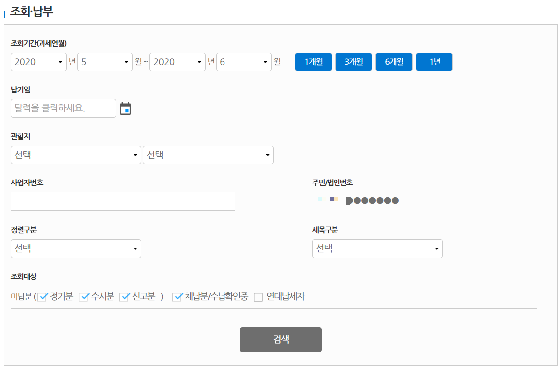 ⭐ 지방세에 진입하게 되면 본인조회납부에서 1)조회기간 2)납기일 3)관할지 4)세목구분을 입력 후 검색을 눌러 조회를 해주시면 됩니다. 여기서 체납액이 조회가 된다면 바로 납부해주시면 되겠습니다.