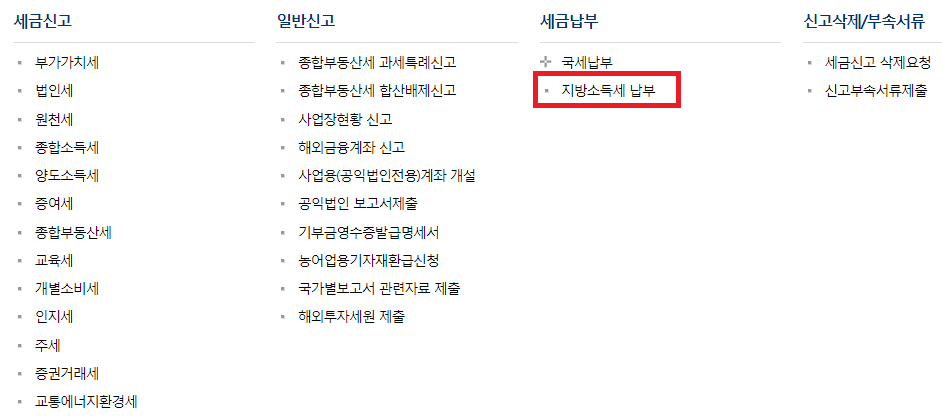 ⭐ 아래 이미지처럼 신고/납부에서 지방소득세 납부 메뉴를 선택해서 진입해줍니다.