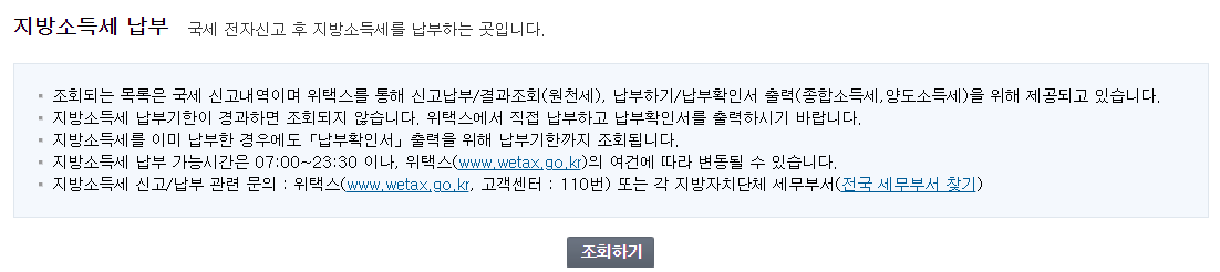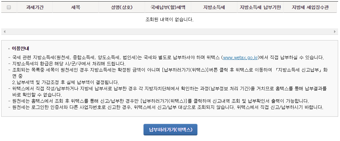 ⭐ 진입을 해주셨다면 마찬가지로 조회하기를 눌러 지방세가 얼마나 체납이되었는지 조회가 가능하고 납부는 위택스에서 납부하실 수가 있습니다.