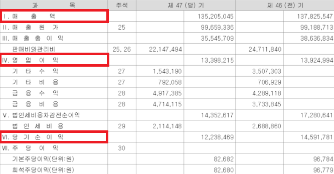 손익계산서에서는 매출액을 기준으로 잡고 비용을 하나하나 빼는 시스템으로 보면 되는데, 밑으로 내려갈 수록 최종 수익이 혹은 손실이 얼마인지 파악할 수가 있습니다.