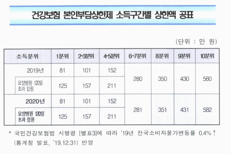⭐ 위 표는 2020년 기준 본인부담상한제 소득구간별 상한액 공표 인데요. 본인이 어느 구간에 해당이 되는지 확인을 필수로 하셔야하겠지요.