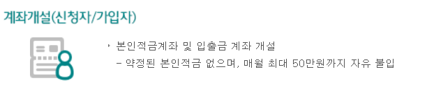 통보를 해줌과 동시에 하나은행으로 신규계좌개설을 해주게 되는데 이때, 본인적금계좌와 입출금 계좌를 만들어서 매월 최대 50만원까지 자유롭게 납입하시면 되는 것입니다.
