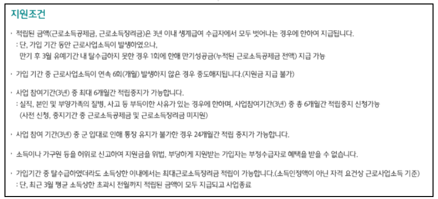 정부에서 일을 하는 생계수급 청년이 가입을 할 수가 있습니다. 매달 발생하는 근로소득공제금을 저축하고 본인이 받는 근로사업소득금에 따라서 이렇게 지원금이 적립되는 형태인데,