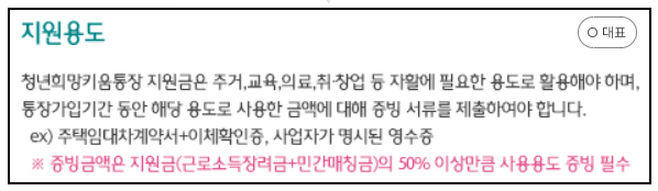또한 이 정책에 지원하는 청년은 이렇게 지원받은 지원금을 주거나 교육 그리고 의료와 취업 등 인생에 도움이 될만한 용도로서 활용해야하는 책임이 있고 통장에 가입한 기간 중에는 사용한 금액에 대해서 증빙서류를 제출해야합니다.