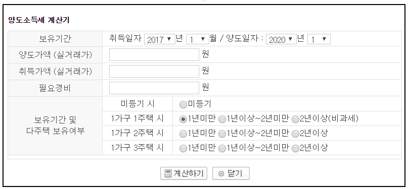 ⭐ 접속을 하게 되면 부동산써브 홈페이지에서 바로 보유기간에서 취득일자와 양도일자 그리고 양도가액과 취득가액을 입렵해줍니다. 그리고 보유기간과 다주택 여부 등을 입력을 하고 계산하기를 눌러줍니다.
