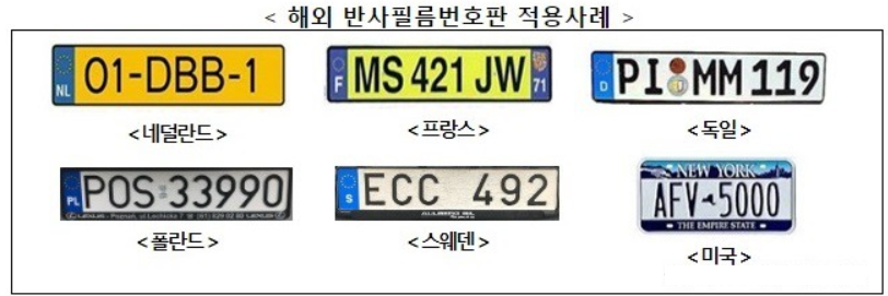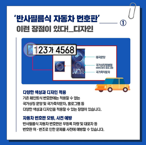 새롭게 나오는 차량에는 부착이 무조건 되겠지만 기존의 차들도 사고율을 줄이기위해 반사필름식 번호판으로 교체해보는 것은 어떨까요.
