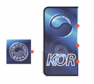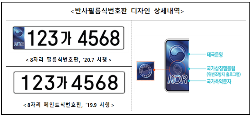 또한, 새롭게 변경되는 반사필름식 번호판에서 보이는 뚜렷한 변화는 바로 기존에 번호판에서는 찾아볼 수가 없었던 대한민국을 상징하는 국가 문양과 국가의 축약문자 그리고 홀로그램 등의 다양한 디자인이 들어가게 됩니다.