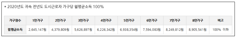 마지막으로는 해당 가구의 한달 평균 소득액이 직전년도 도시근로자 가구평균소득에 100%이하여야합니다. 아래 표를 보시면 기준 금액을 확인 하실 수가 있습니다.