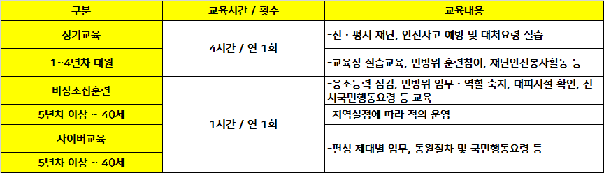 민방위는 아래처럼 연 1회만 받으시면 되게 됩니다. 1년차에서 4년차까지는 4시간 5년차부터는 1시간만 민방위를 받으면 됩니다.
