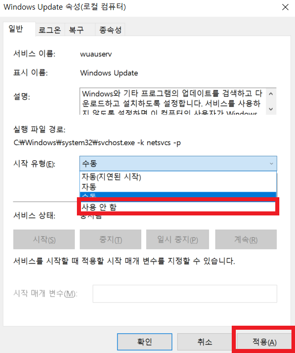 윈도우 업데이트 속성으로 들어오셨으면 시작유형을 '수동'에서 '사용안함'으로 바꾸어 준 뒤 적용과 확인을 눌러주면 모든 설정이 완료 되게 됩니다. 간단하죠?