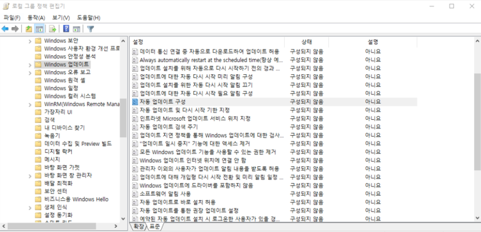 아래처럼 로컬그룹 정책편집기로 진입한 뒤 windows 업데이트에서 자동업데이트 구성을 찾아 줍니다.