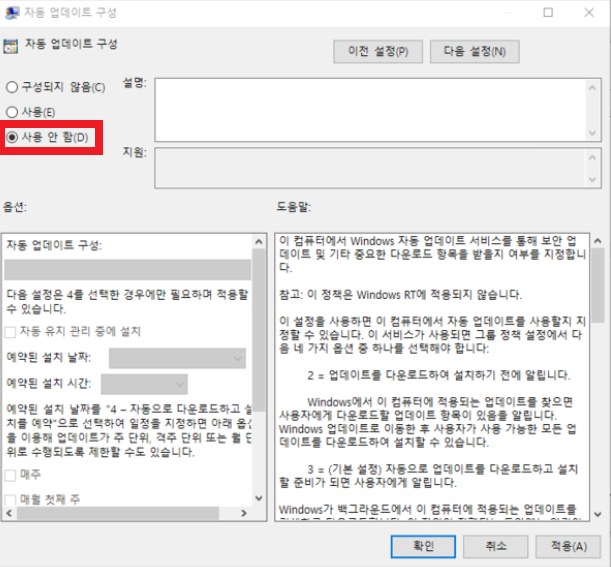자동업데이트 구성에서 사용안함으로 설정해주시면 윈도우10 자동업데이트가 꺼지게 됩니다.
